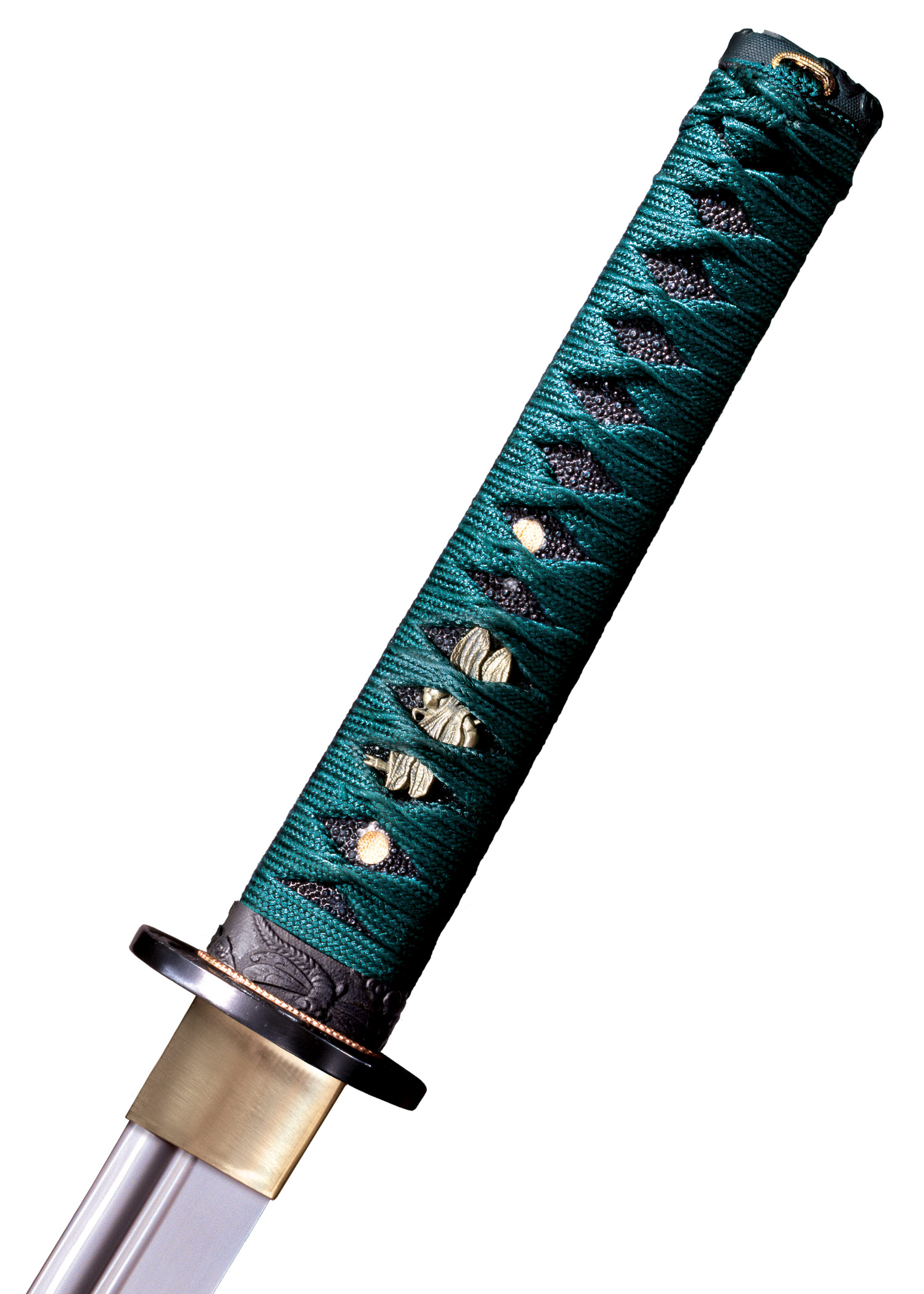 - Rankena: Aptraukta raja oda (Samé), apvyniota akvamarino spalvos šilkine virvele su žalvario Menuki.