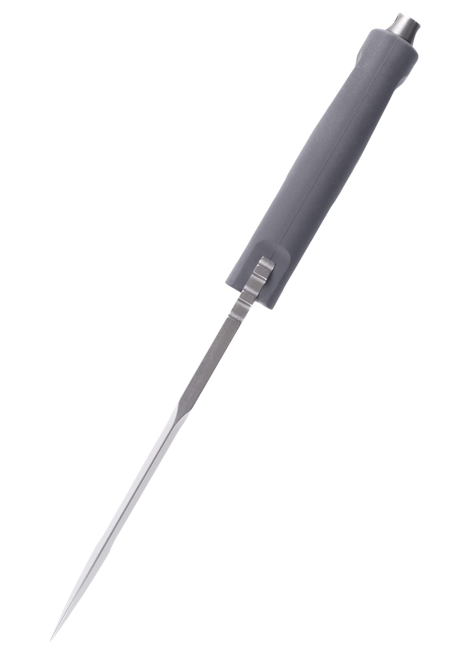 Forprene rankena, vilko pilkos spalvos, užtikrina tvirtą ir ergonomišką suėmimą. Inovatyvus rankenos tvirtinimas be šoninių varžtų, naudojant kūgio formos nerūdijančio plieno veleną, kuris prisukamas prie pagrindo, suteikia peiliui išskirtinį masyvumą ir idealų balansą. Minimalistinė, bet funkcionali nailono makštis, suderinama su MOLLE sistema, leidžia patogiai ir saugiai transportuoti peilį.