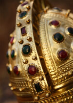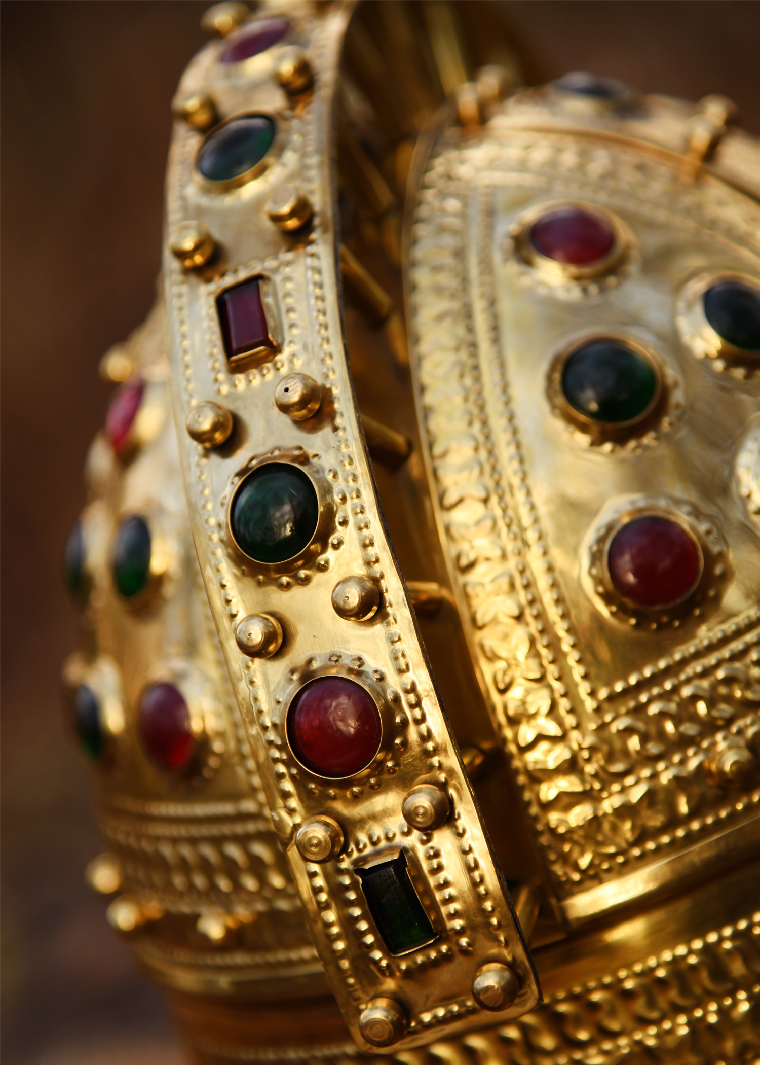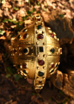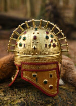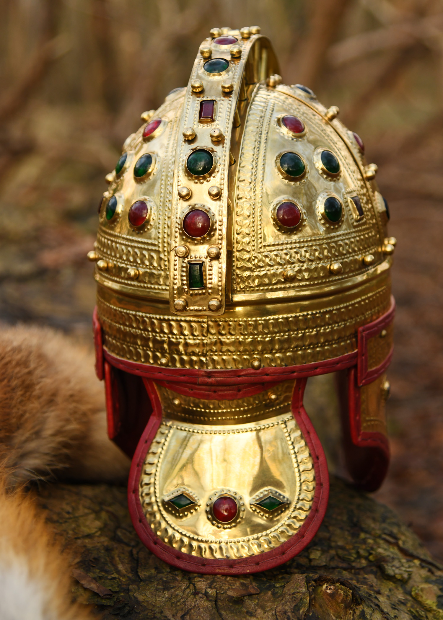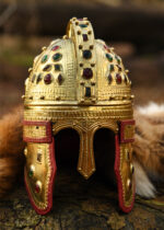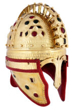 Mūsų šalmas turi prisiūtą raudonos odos intarpą, o ornamentai pagaminti iš stiklo. Šalmas yra paminkštintas tiek ant skruostų atvartų, tiek ant kaklo apsaugos.