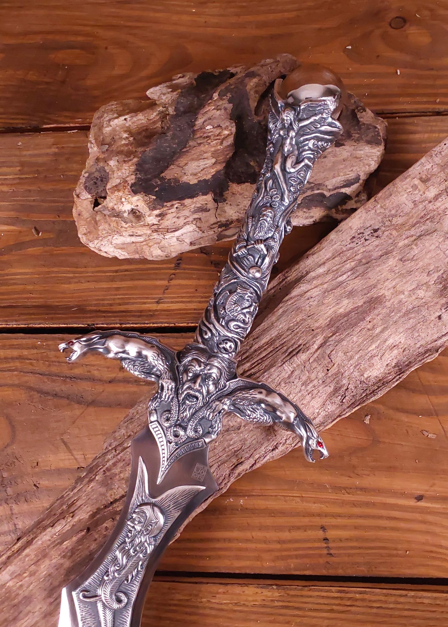 Merlino kardas, pagamintas iš nerūdijančio plieno ir pasižymintis apie 120 cm bendru ilgiu, yra unikalus kolekcinis modelis su nedideliais defektais. Jis puikiai tinka ekspozicijai ar istorinių atributų rinkiniui papildyti, atspindėdamas viduramžių stilių.