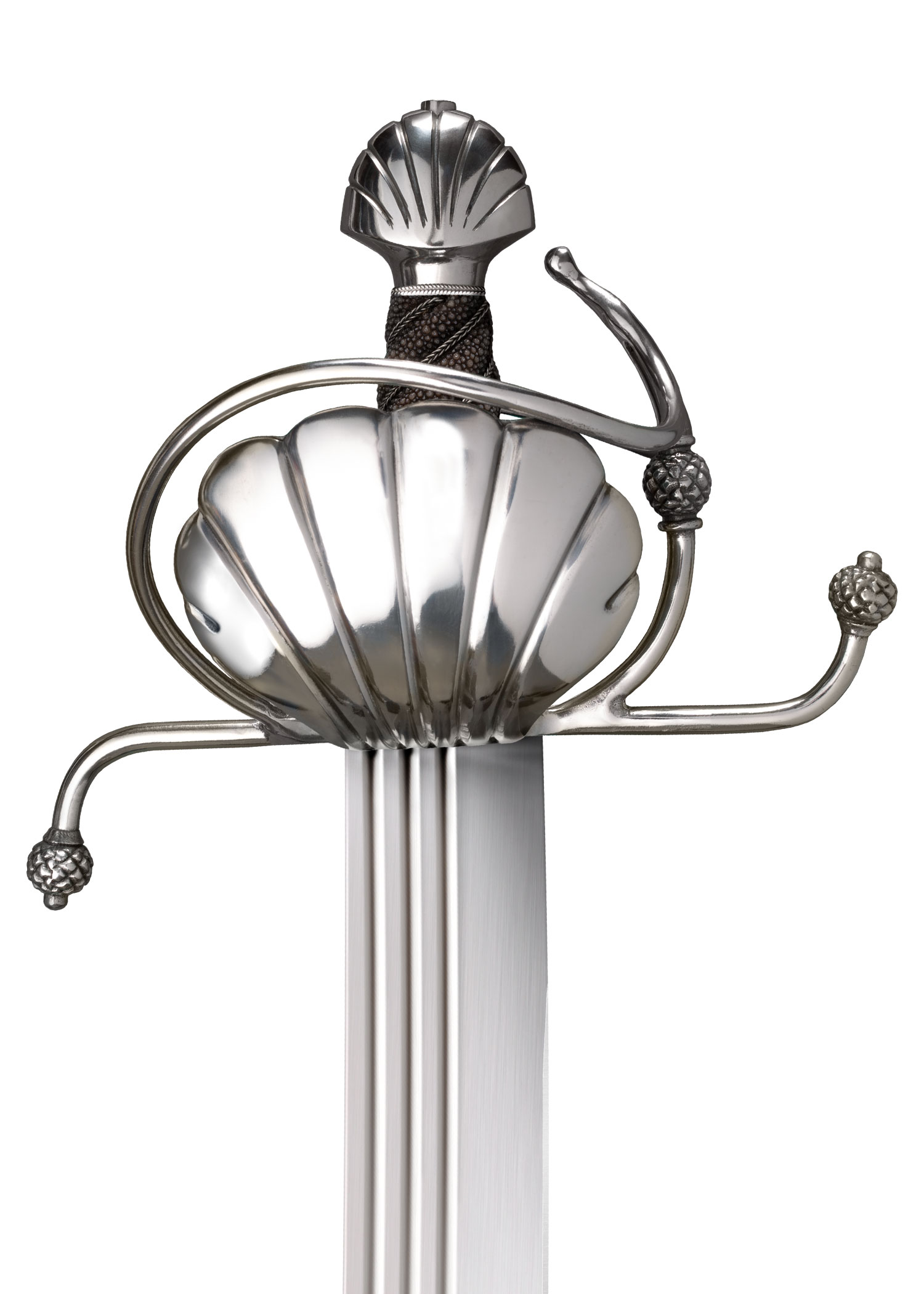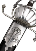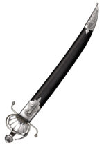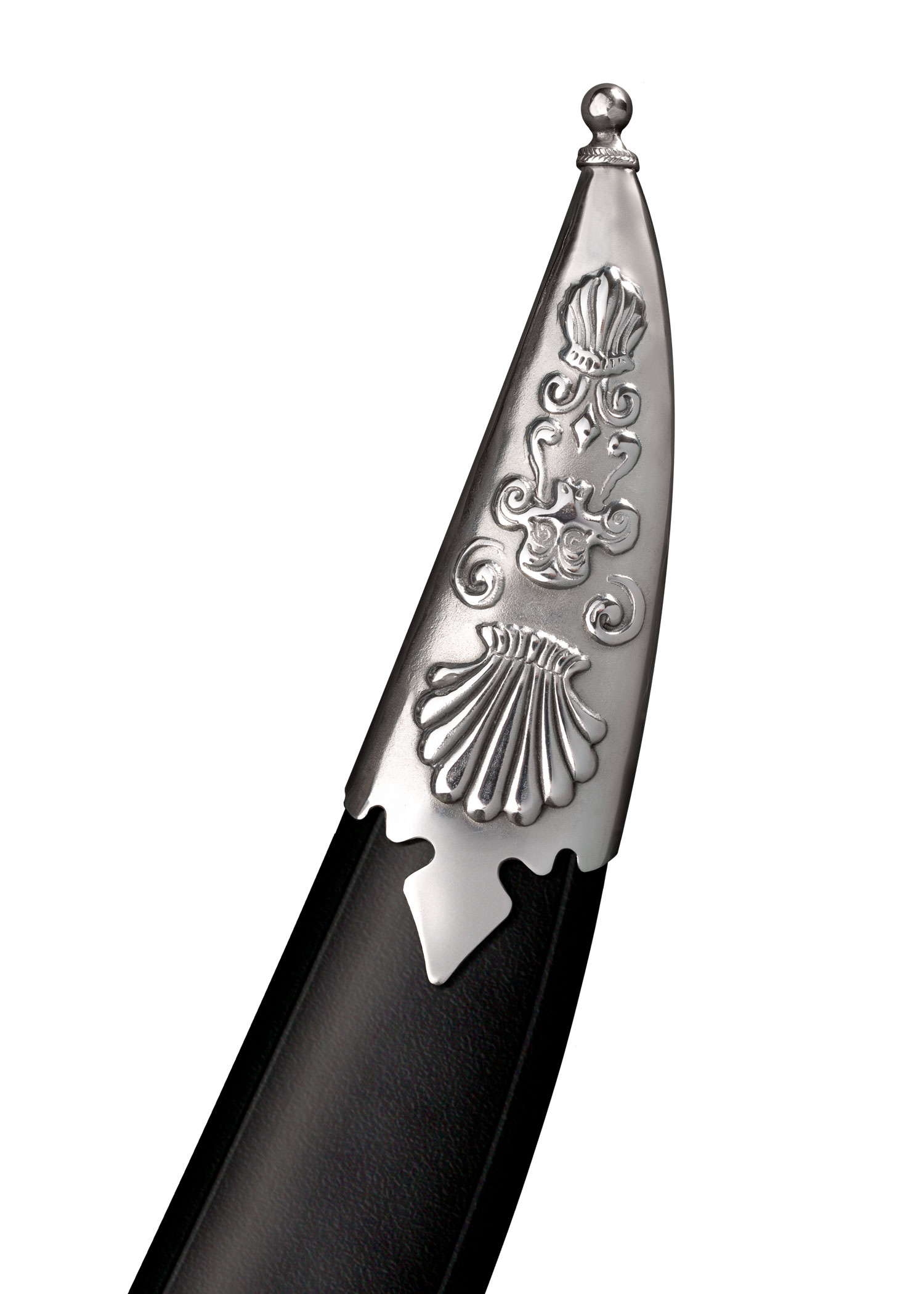 Šis kalavijas pagamintas iš 1055 anglinio plieno, pasižymi autentiška, lenkta geležte, kuri gale šiek tiek platesnė, su aukštesne nugarėle priekyje. Trijų įdubų detalės siauresnėje geležtės dalyje suteikia jai papildomo autentiškumo. Išskirtinė S formos garda išlenkta link geležtės ir rankenos, o kriauklės formos krepšelis, papuoštas uogų formos akcentais, užtikrina eleganciją ir apsaugą. Juoda oda aptraukta rankena baigiasi vėduoklės formos galvute, o komplekte esanti juoda makštis su sidabro spalvos antgaliu ir apkaustu, dekoruotais jūriniais motyvais ir kriauklėmis, pabrėžia produkto išbaigtumą. Makšties antgalis taip pat turi metalinę kilpą patogiam pakabinimui ant diržo.