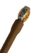 - Rankena pagaminta iš metalo lydinio su odine apvija ir gintaro imitacijos galvute.